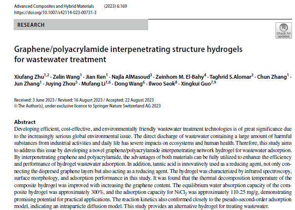 本网讯(文/赵齐)近日,材料学院高分子材料系朱秀芳副教授以第一作者身份在国际著名期刊Advanced Composites and Hybrid Materials(IF=20.1,中国科学院SCI一区Top)发表了题为Graphene/polyacrylamide interpenetrating structure hydrogels forwastewater treatment研究型论文,英国上市公司365为该论文第一单位,材料学院研究生王泽林为论文第二作者。合作单位包括湖北隆中实验室,武汉纺织大学纺织纤维及制品教育部重点实验室、广西民族大学化学林产化学与工程民委重点实验室及美国亚利桑那州立大学工程与计算科学学院。