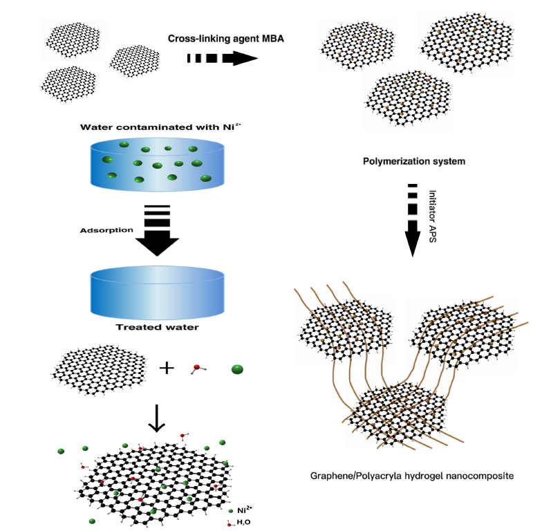 该论文以解决水体污染为目标,将特殊的石墨烯结构引入互穿网络水凝胶中,通过自由基聚合方式,成功将石墨烯以酯化方式固定在结构骨架中。该研究中,鞣酸不仅创新性用作还原剂,而且起到可以连接石墨片层结构,达到固定石墨烯,防止其游离的作用。复合水凝胶通过红外光谱,扫描电镜,吸附实验等方式方法进行表征,研究表明复合水凝胶热分解温度随着石墨烯含量增加而增加,平衡态吸水率约300%,对镍离子吸附能力达到110.25mg/g,显示了其可观应用前景。此外,还研究了其吸附动力学,结果表明其更接近与准二级吸附模型。