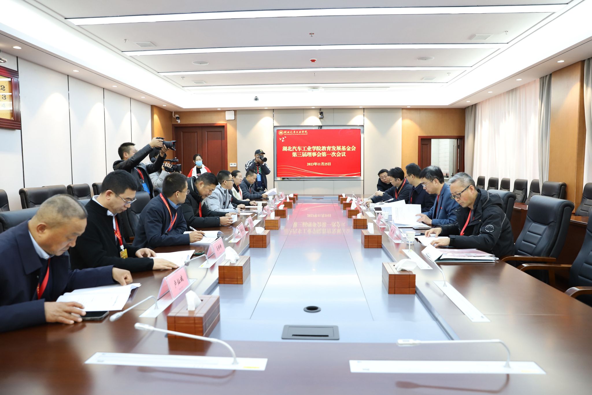 随后,基金会第一次理事会在产教大楼三楼多功能会议室召开,第三届理事会全体成员参加会议。会议审议并通过了基金会向学校捐赠事宜。