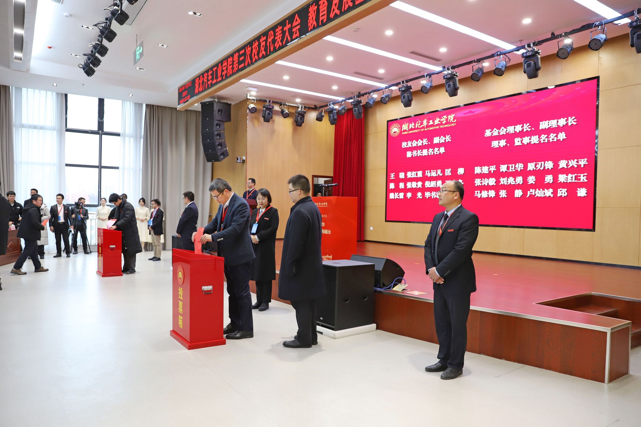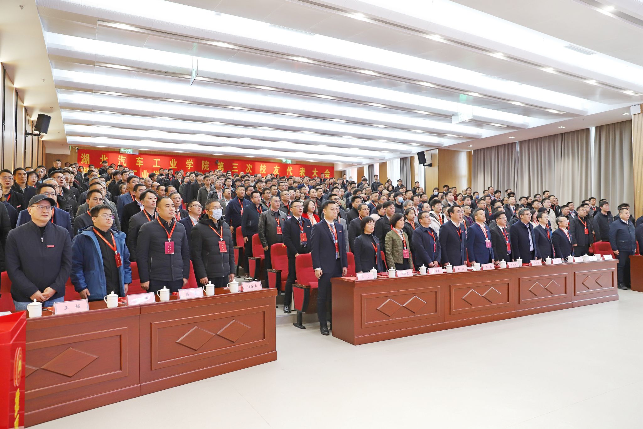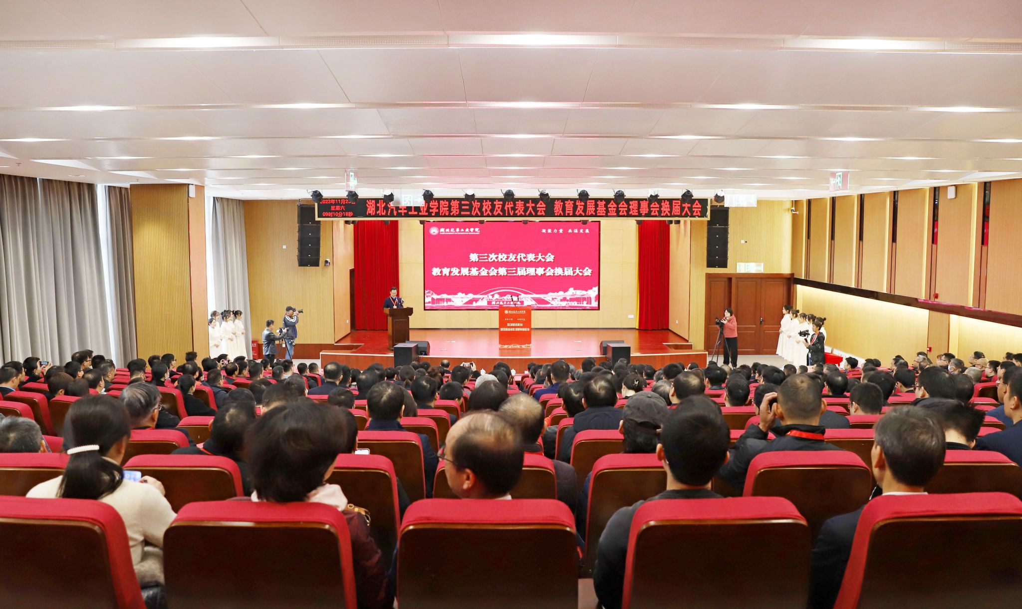 本网讯(文/图 广娟、邓玉洁、李一凡)11月25日上午,学校第三次校友代表大会、教育发展基金会第三届理事会换届大会在产教大楼四楼报告厅举行。来自全国各地的校友代表欢聚母校,共叙情谊、凝聚力量、共谋发展。十堰市政府副市长罗耀华,东风汽车集团有限公司、陕西汽车控股集团有限公司、市直部门和张湾区相关领导出席大会,全国32个校友分会代表,全体校领导、副处级以上干部、在校生代表参加会议。党委副书记陈建平主持大会。