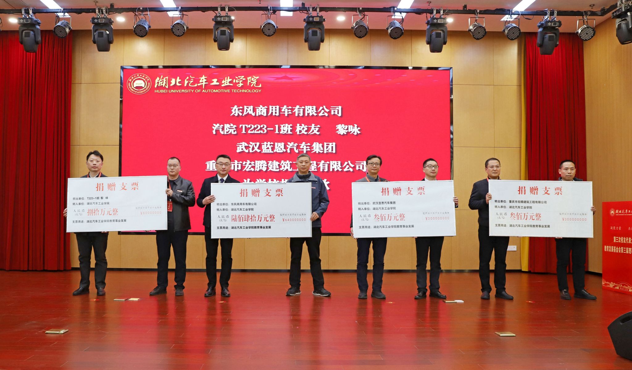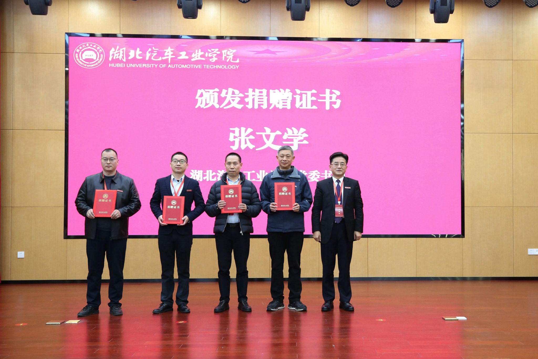 会上还举行了捐赠仪式。东风商用车有限公司、T223-1班校友黎咏、武汉蓝恩汽车集团、重庆市宏腾建筑工程有限公司现场为学校捐赠善款。张文学为捐赠代表颁发证书。