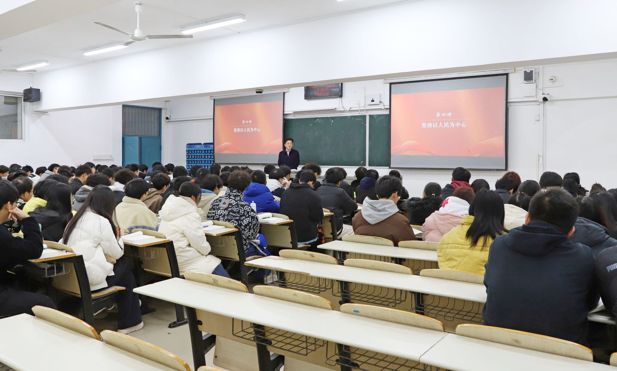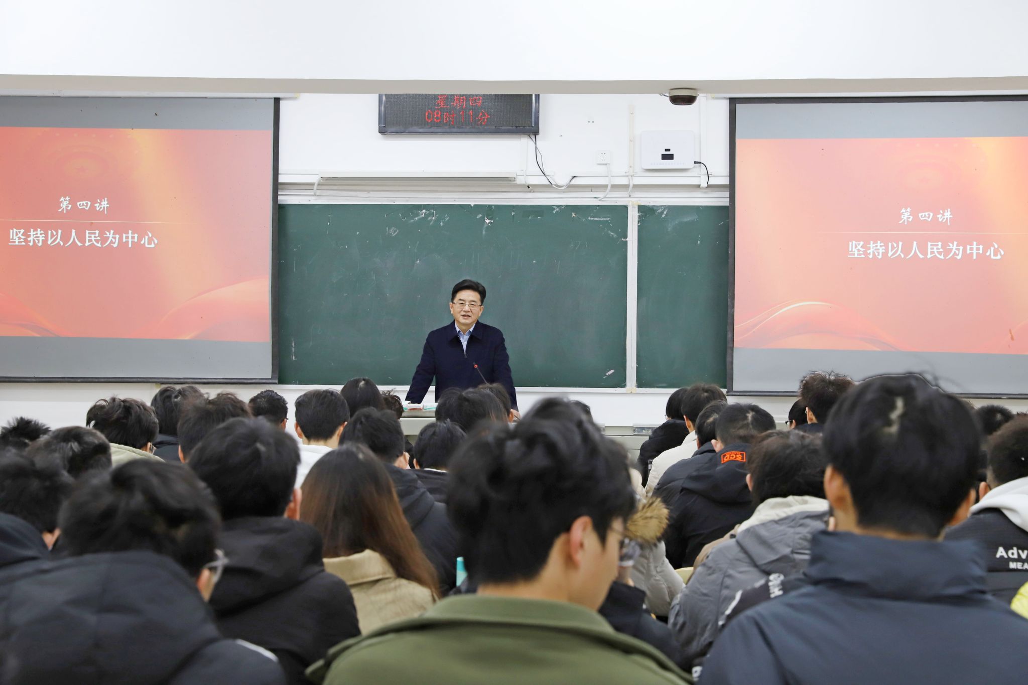 本网讯(文 王莽莽/图 广娟)11月30日,校党委书记张文学走进课堂,以“坚持以人民为中心”为题,给学生们上了一堂生动的思政课。
