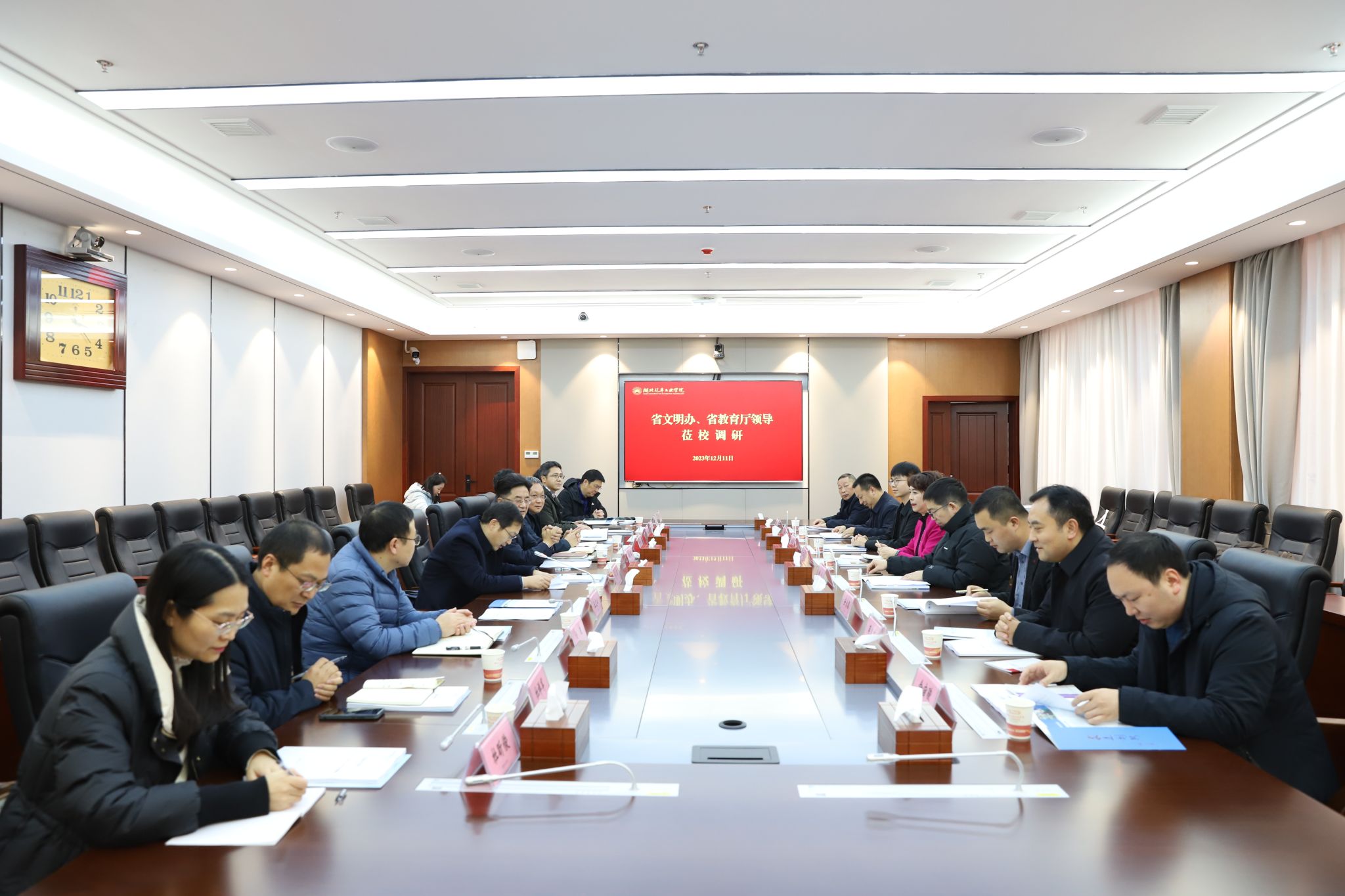 本网讯(文/图 邓玉洁)12月11日下午,省委宣传部文明创建三处处长万春梅、舆情信息处处长谢云、文明创建三处主任科员郭家麒、省教育厅思政处主任科员安永德一行来校调研政治生态分析研判与文明校园创建工作。校党委书记张文学,党委副书记李涛,党委常委、组织(统战)部部长王镇参加座谈交流。