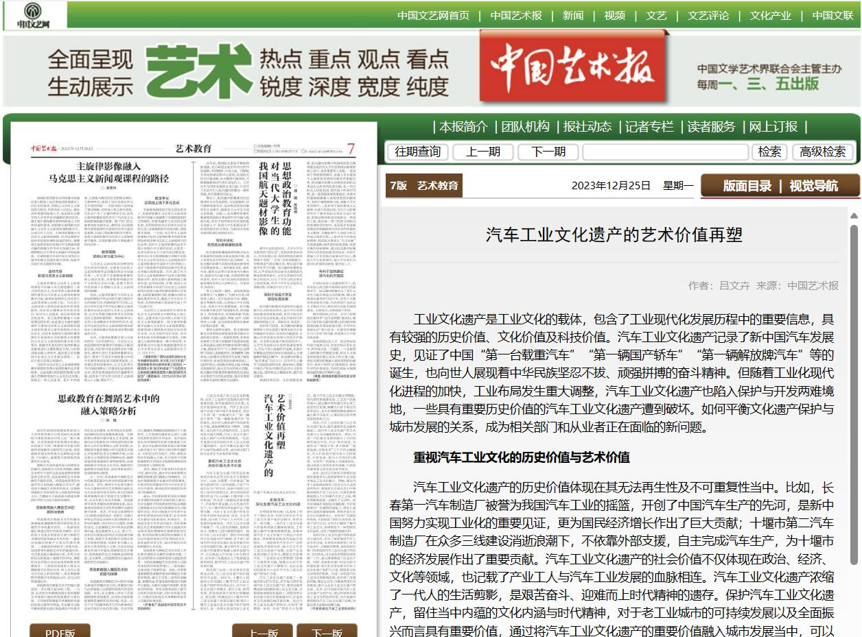 本网讯(文/图 何沛然)12月25日的《中国艺术报》发表了艺术与设计学院吕文卉博士撰写的《汽车工业文化遗产的艺术价值再塑》一文。该文章论述了汽车工业文化遗产的历史、文化和艺术价值,并针对汽车工业遗产保护和利用过程中存在的问题与挑战,提出了“博物馆-商旅-市政”的组合开发模式,艺术与科技深度融合等具体措施,延续工业遗产的历史文脉、提升工业遗产的艺术美感与人文内涵。