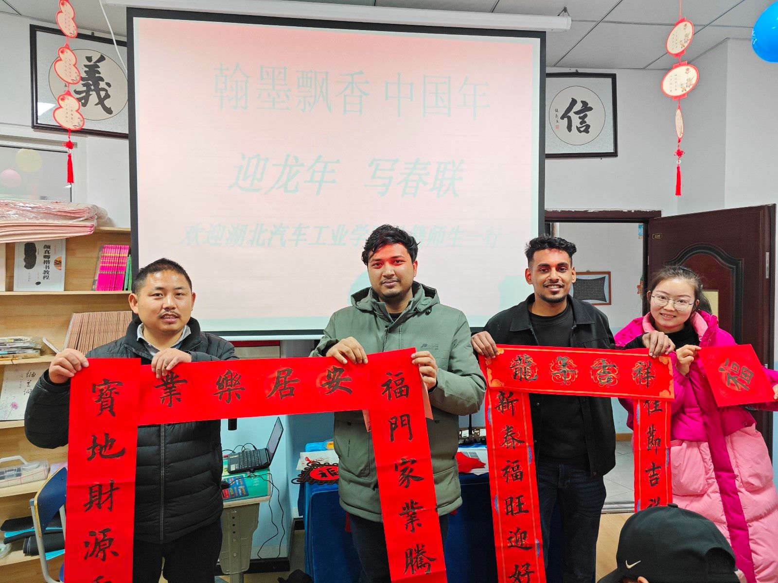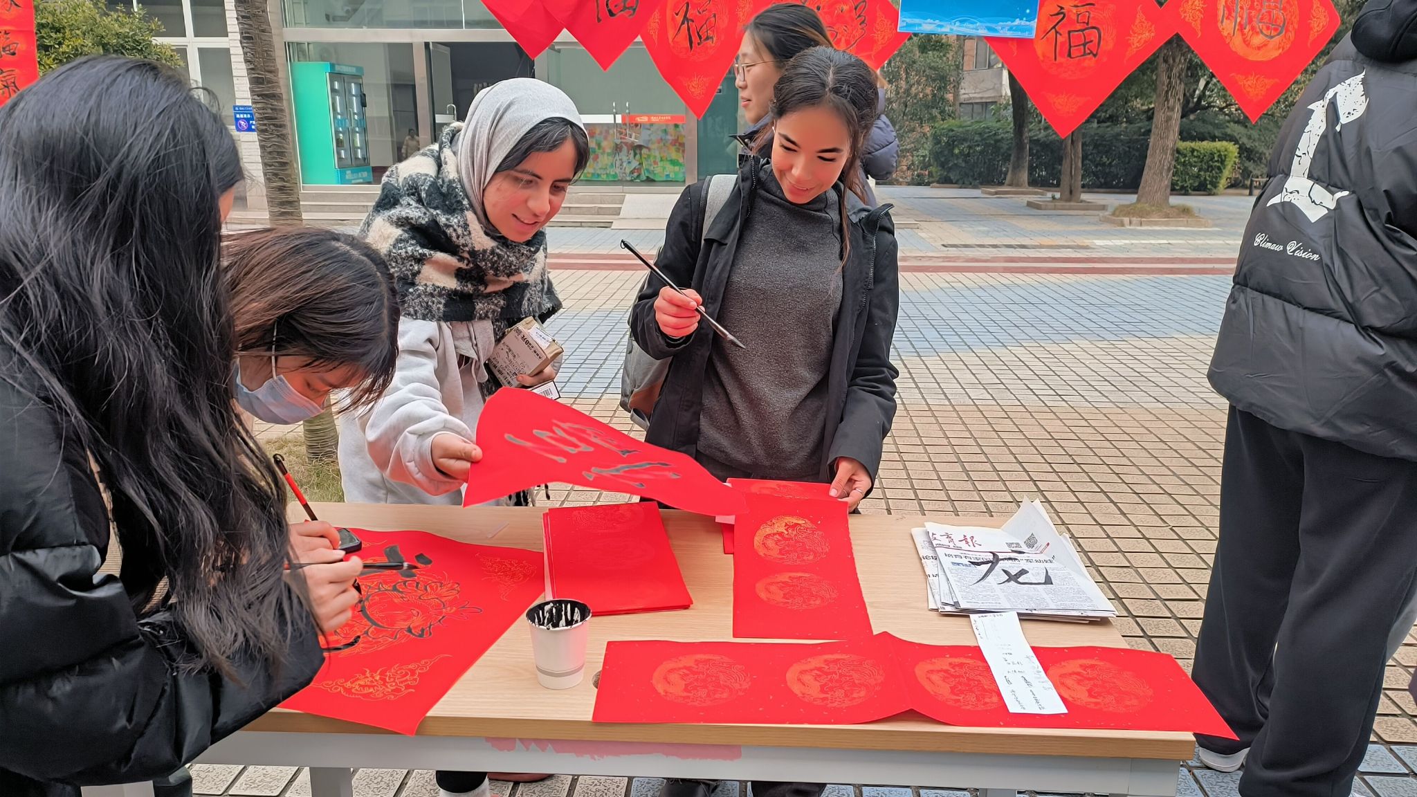 活动在“年、春、福”等为首字的四字词语或诗句抢答中拉开帷幕,随后介绍了中国传统书法的历史渊源,教授了毛笔的正确握笔姿势和汉字书写技巧。留学生开始用毛笔字书写中国古诗词和春联,并主动了解春联所蕴含的深刻含义。留学生们在欢乐祥和的新年氛围中迎接新年的到来,并表示要把新春的美好祝愿用中国汉字的文化形式传递到新的一年。