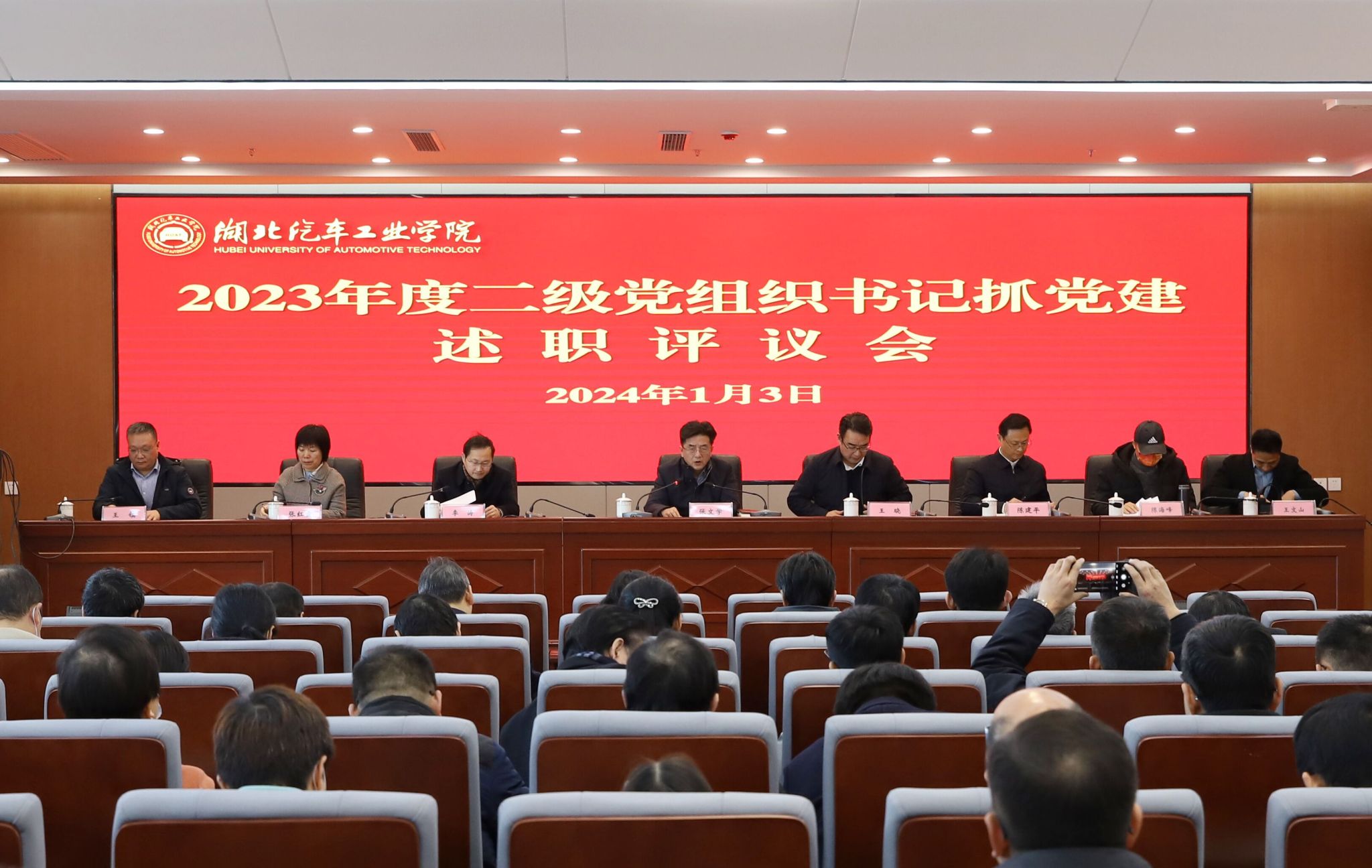 本网讯(文/图 邓玉洁)1月3日上午,2023年度全校述职述廉大会暨二级党组织书记抓党建述职评议会在产教大楼三楼报告厅举行。全体在家校领导、中层干部、“两代表一委员”、民主党派负责人、工会委员会委员代表、教师代表齐聚一堂,总结交流2023年工作。会议由党委副书记李涛主持。