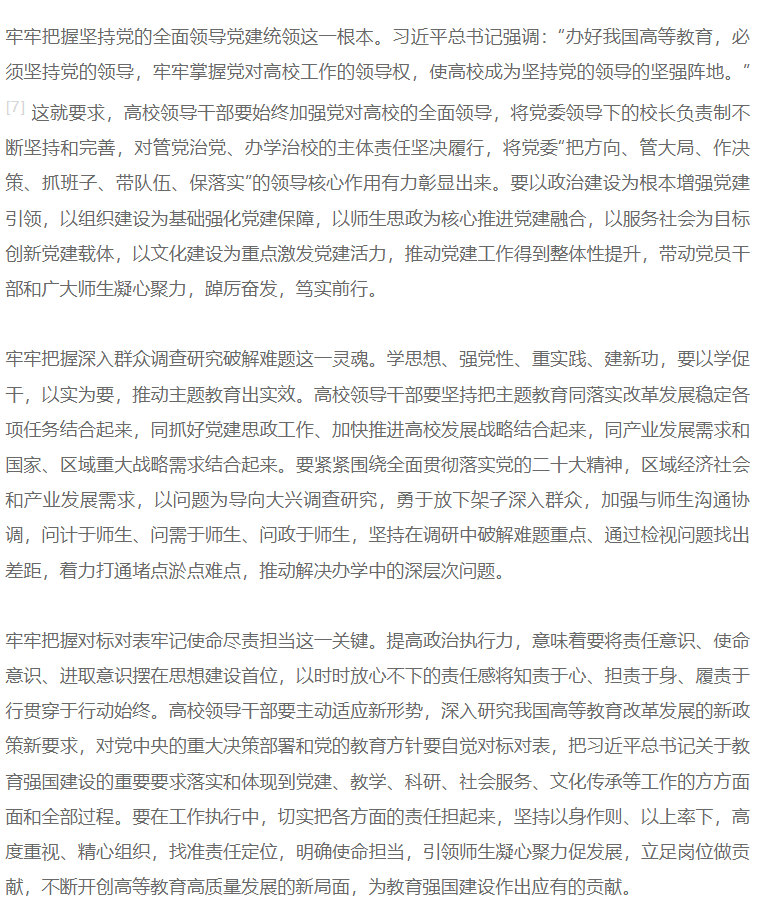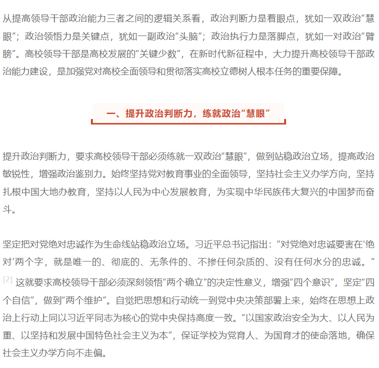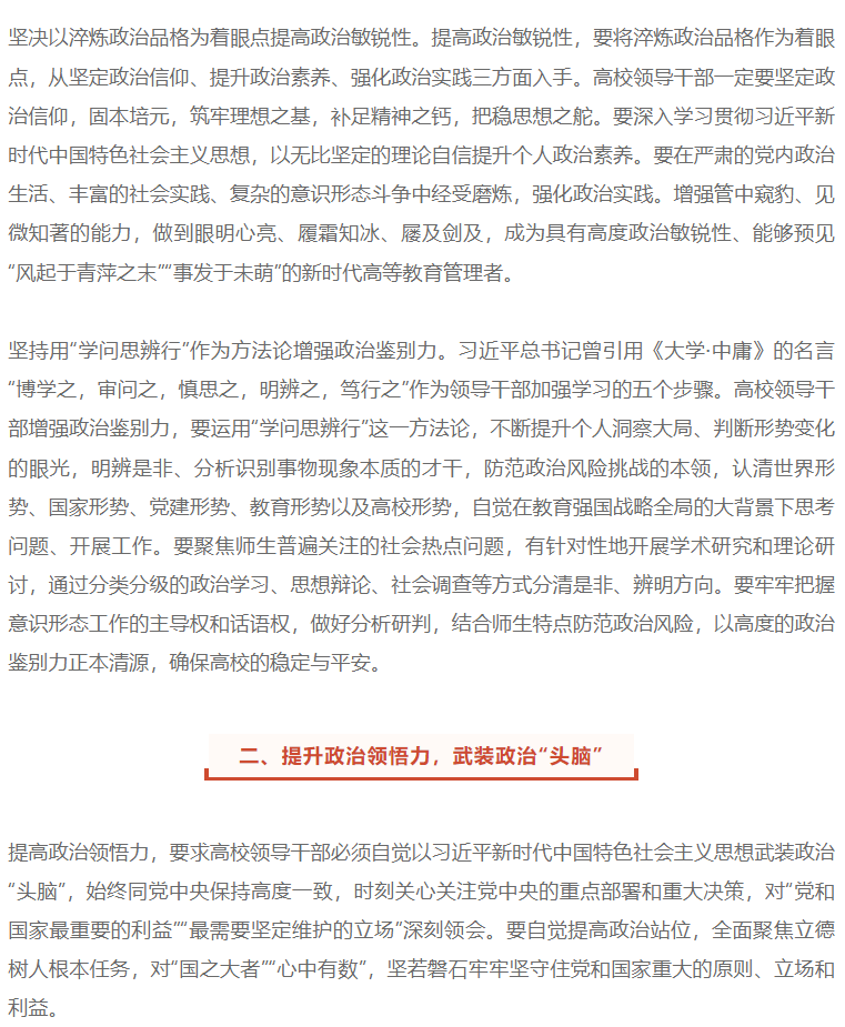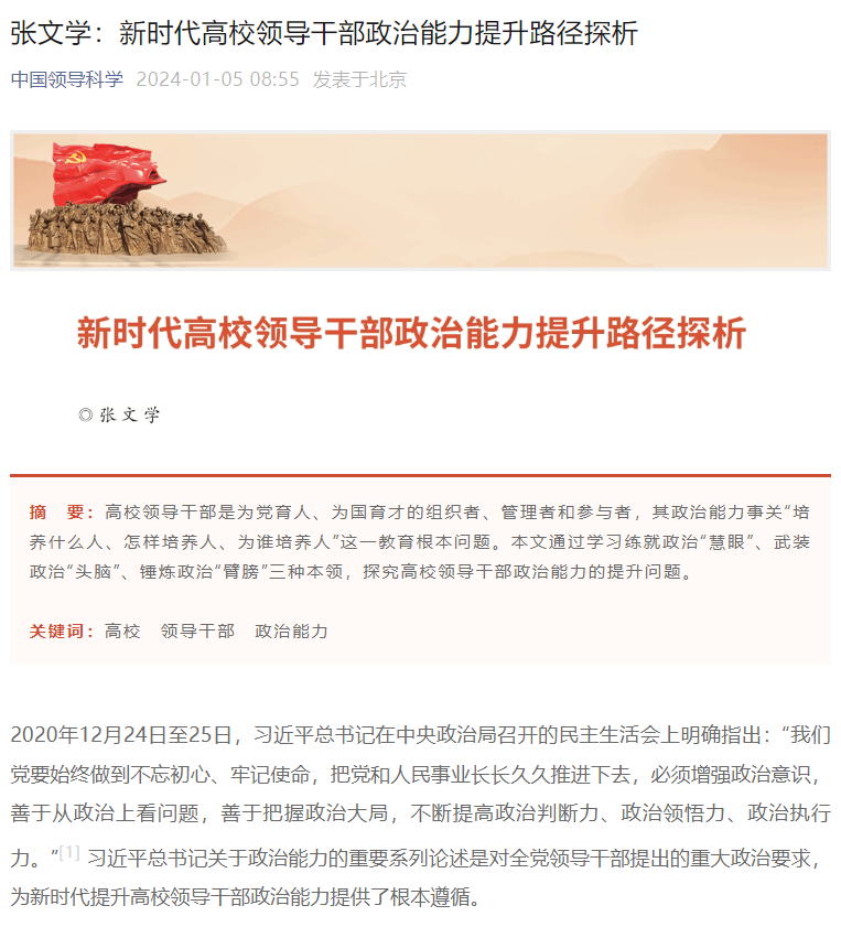 近日,由中共中央党校(国家行政学院)主管,中国领导科学研究会、中共中央党校出版社主办的《中国领导科学》杂志2023年第6期,刊发了英国上市公司365党委书记张文学理论文章《新时代高校领导干部政治能力提升路径探析》。文章通过学习练就政治“慧眼”、武装政治“头脑”、锤炼政治“臂膀”三种本领,探究了高校领导干部政治能力的提升问题。原文如下: