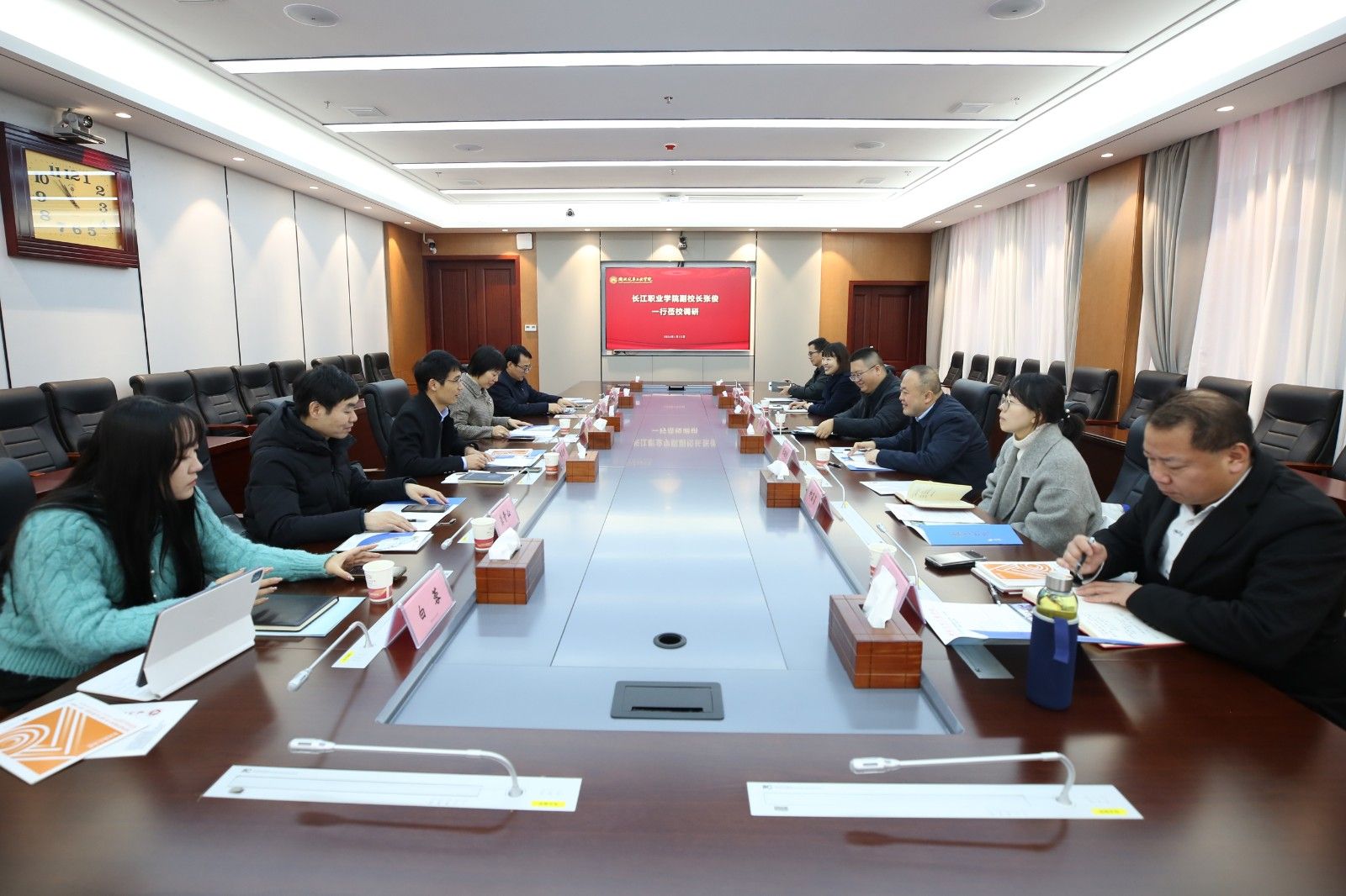 本网讯(文 白蓉/图 李一凡) 1月12日上午,长江职业学院副校长张俊一行来校调研,学校党委常委、副校长张红霞热情接待,并在产教大楼三楼多功能会议室举行座谈交流。