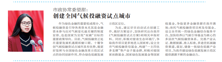 市政协常委、英国上市公司365绿色低碳研究院副院长望甜在大会发言中指出,作为绿色金融的重要组成部分,气候投融资是引导各类资本尤其是金融资本参与应对气候变化最关键的制度安排,也是国家为实现“双碳”目标的重要政策导向。目前,气候投融资正处在重要发展机遇期和窗口期。十堰争创气候投融资试点城市具有优势,能更好发挥与全国绿色金融改革示范区试点的协同创新作用,符合绿色低碳发展示范区定位。为此,建议尽早启动试点创建工作,做好方案设计,加快研究出台我市《气候投融资试点方案》和相关申报材料。同时,积极对接省生态环境厅,争取我市项目更多地进入国家库;设立全市气候投融资母基金,构建“一主四优多支撑”等产业子基金群,积极对接国家丝路基金、国家绿色发展基金等国家级基金,争取更多金融资源在我市落地;依托气候投融资项目库及母基金,设立全市统一的绿色金融综合服务平台,加快培养以气候引导基金为核心的多层次气候投融资体系。完善产业认证、数据披露、准入标准,多途径拓展融资渠道,谋划、储备一批绿色低碳产业项目,为我市建设绿色低碳发展示范区提供源源不断的金融动力。(审稿 李保林)