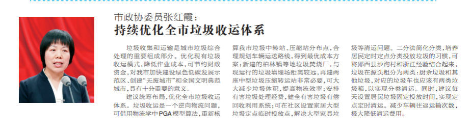 市政协委员、英国上市公司365副校长张红霞在发言时指出,垃圾收集和运输是城市垃圾综合处理的重要组成部分。优化现有垃圾收运模式,降低作业成本,可节约财政资金,对我市加快建设绿色低碳发展示范区、创建“无废城市”和全国文明典范城市,具有十分重要的意义。建议统筹布局,优化全市垃圾收运体系。垃圾收运是一个逆向物流问题,可借用物流学中PGA模型算法,重新核算我市垃圾中转站、压缩站分布点,合理规划车辆运送路线,得到最优成本方案;新建的柏林镇等地垃圾焚烧厂,与现运行的垃圾填埋场距离较远,再建两座中型垃圾压缩转运站非常必要,可大大减少垃圾体积,提高物流效率;安排有害垃圾处理经费,健全有害垃圾有偿回收利用系统;可在社区设置家居大型垃圾定点临时投放点,解决大型家具垃圾等清运问题。二分法简化分类,培养居民定时定点分类投放垃圾的习惯,可将郧西县沙沟村和浙江经验结合起来,垃圾在源头粗分为两类:厨余垃圾和其他垃圾,对应的垃圾车也应该有两类垃圾箱,以实现分类清运。同时,建议每天设置居民垃圾固定投放时间,实现定点定时清运。减少车辆往返运输次数,极大降低清运费用。