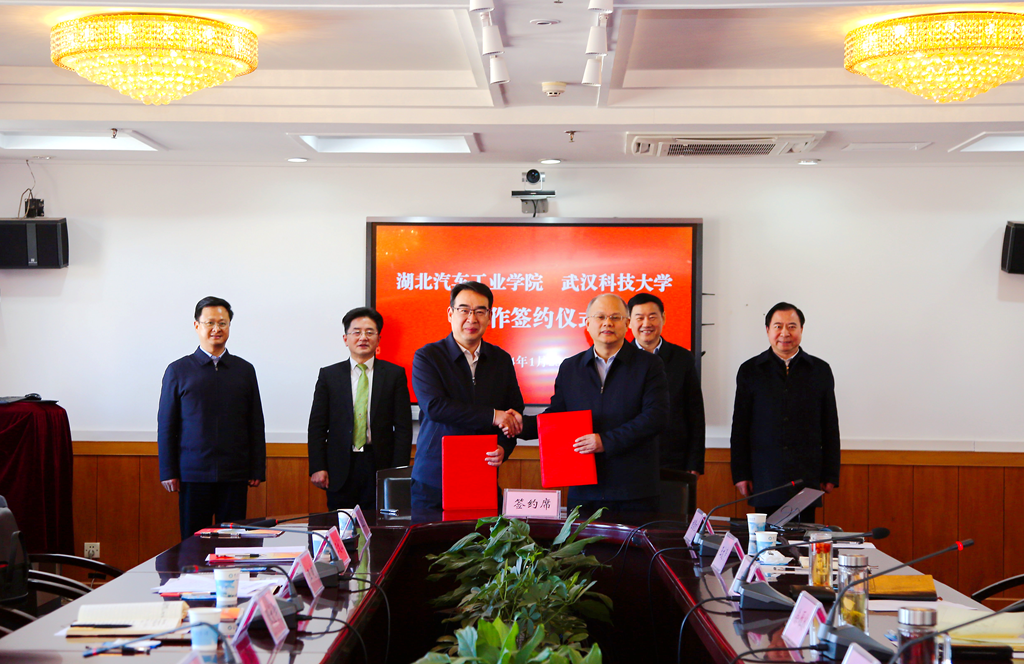 倪红卫、王晓代表校校双方签署了全面战略合作协议。张文学向武科大赠送了“混合动力”车模。