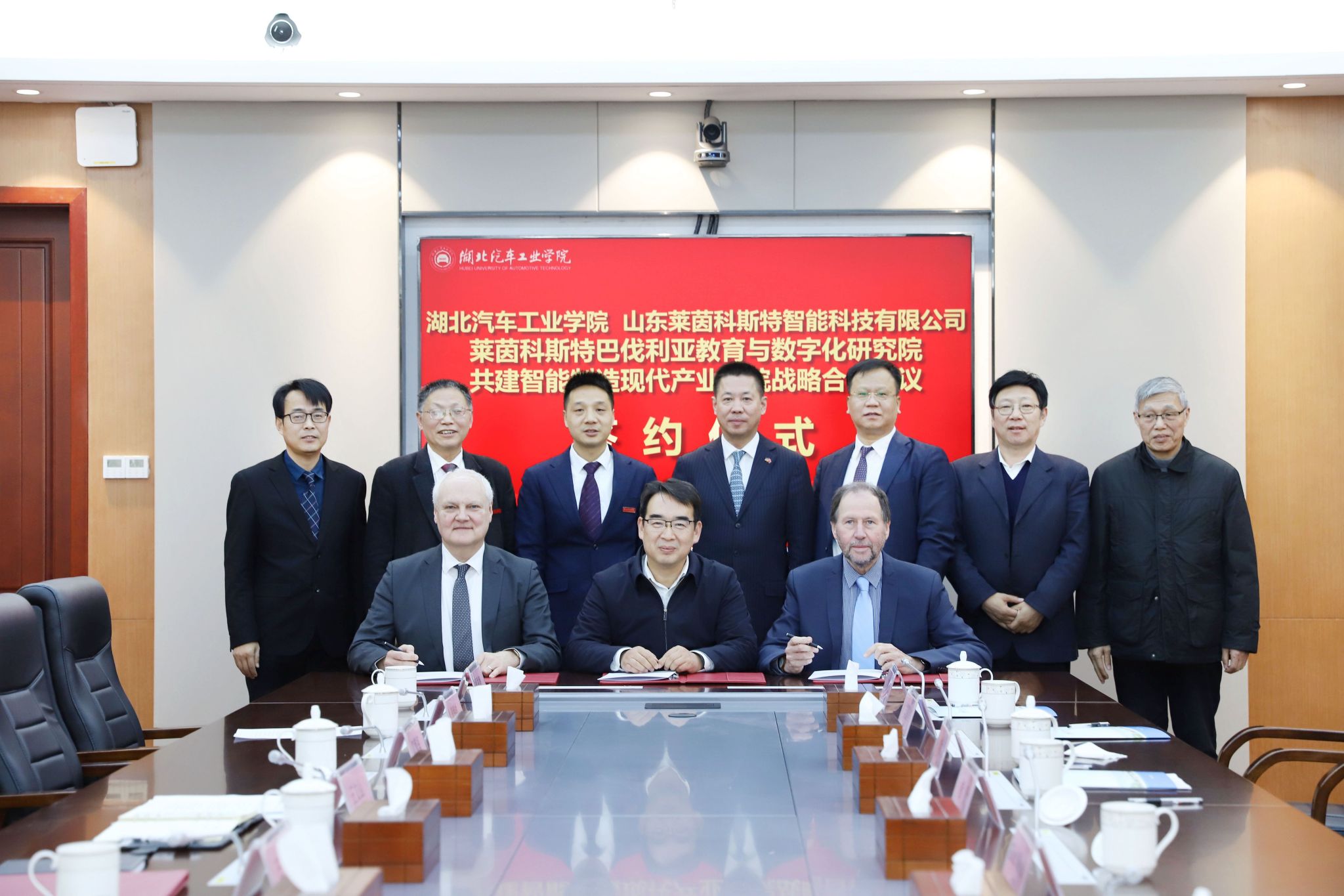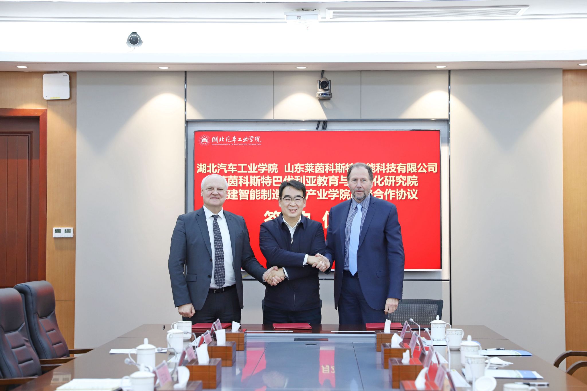 交流座谈结束后,学校与山东莱茵科斯特智能科技有限公司、莱茵科斯特巴伐利亚教育与数字化研究院三方共同签署了共建智能制造现代产业学院战略合作协议。