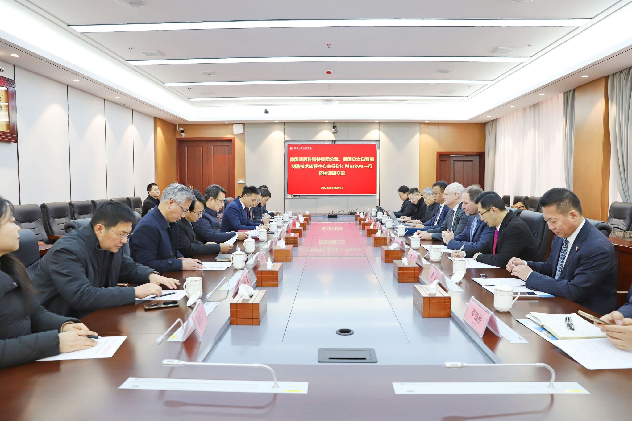 本网讯(文 徐正凯/图 广娟)1月29日上午,德国莱茵科斯特集团总裁Eric Moskwa(艾瑞克·莫斯卡瓦)、莱茵科斯特巴伐利亚教育与数字化研究院董事会主席LotharBudd(洛塔尔·布德)、山东莱茵科斯特智能科技有限公司董事长、总经理崔智一行莅校调研并在产教大楼三楼多功能会议室举行交流座谈会,校长王晓出席会议,会议由党委常委、党政办公室主任王文山主持。