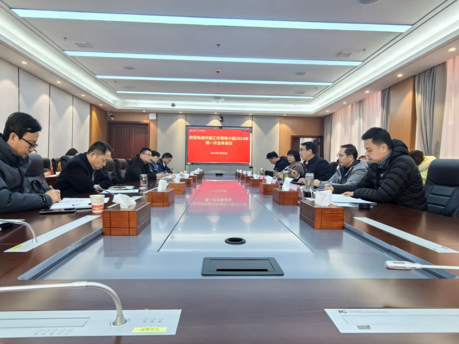 本网讯(文 官杰/图 薛树森)为进一步做好学校2024年防范电诈和禁毒工作,1月30日下午,学校在产教大楼三楼会议室召开防范电诈工作领导小组2024年第一次全体会议和禁毒工作领导小组2024年第一次全体会议。校领导王晓、李涛、张红霞、高刃、王镇、王文山出席会议。会议由王文山主持。