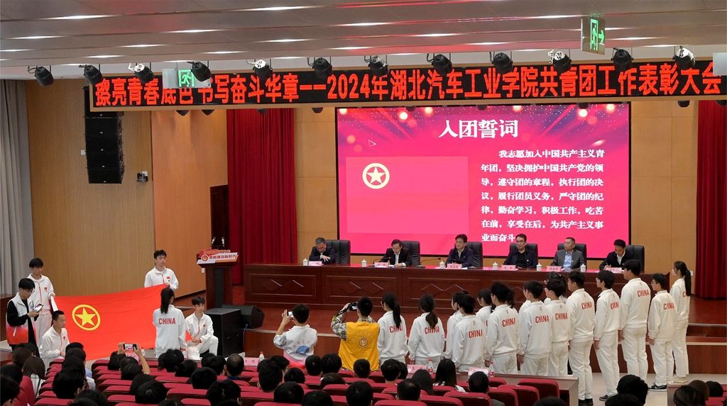 2023年湖北省“百生讲坛”金牌主讲人经济管理学院物流211班冯倩同学进行了风采展示;优秀共青团干部代表、数理与光电工程学院分团委书记李萌同志作了经验交流。新入团学生代表面向团旗进行庄严宣誓。