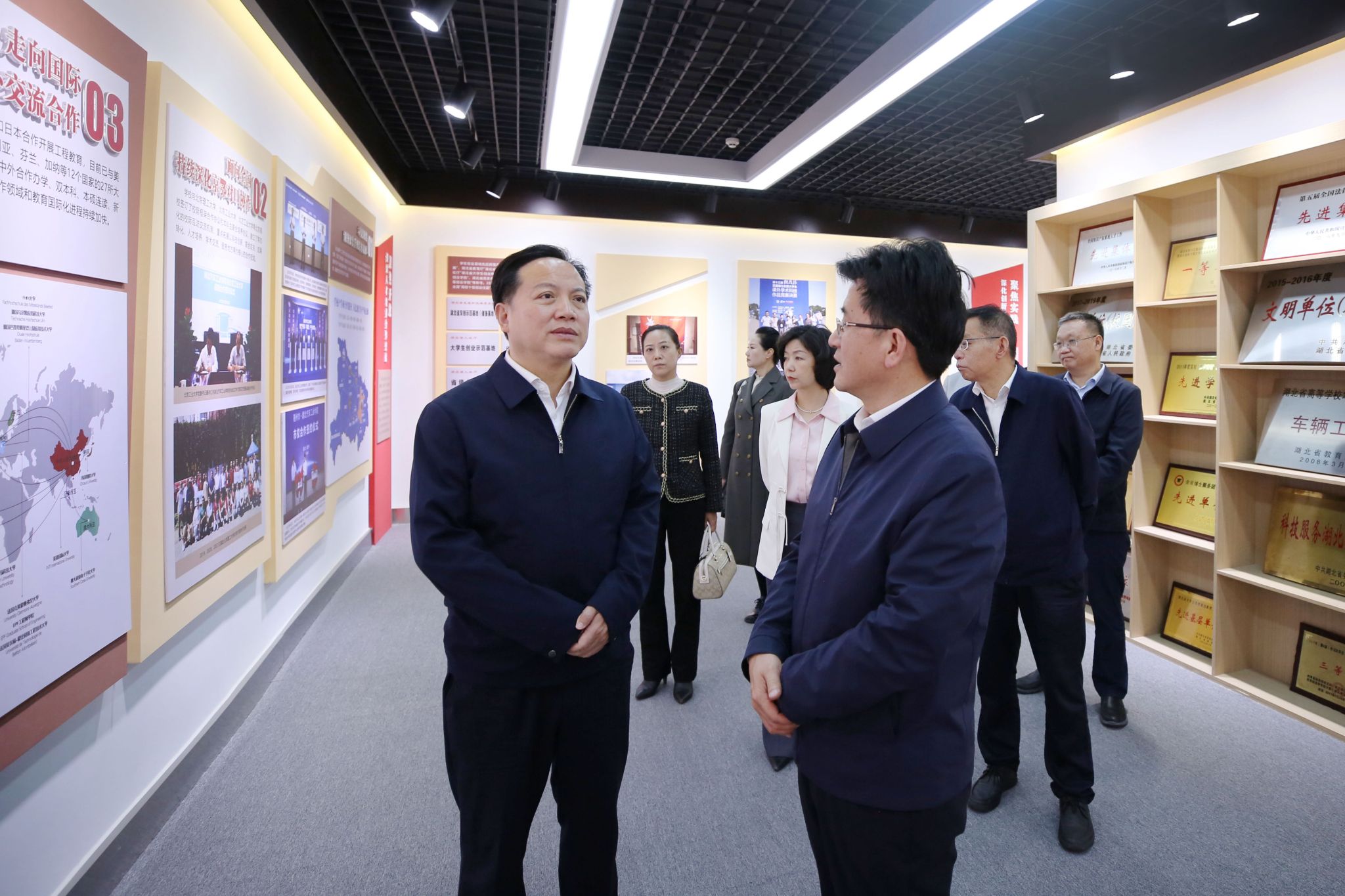 吴善宏一行在校党委书记张文学、校党委副书记、校长王晓、校党委常委、组织部长王镇的陪同下考察了学校扩建校区、参观了校史馆和科创展厅。