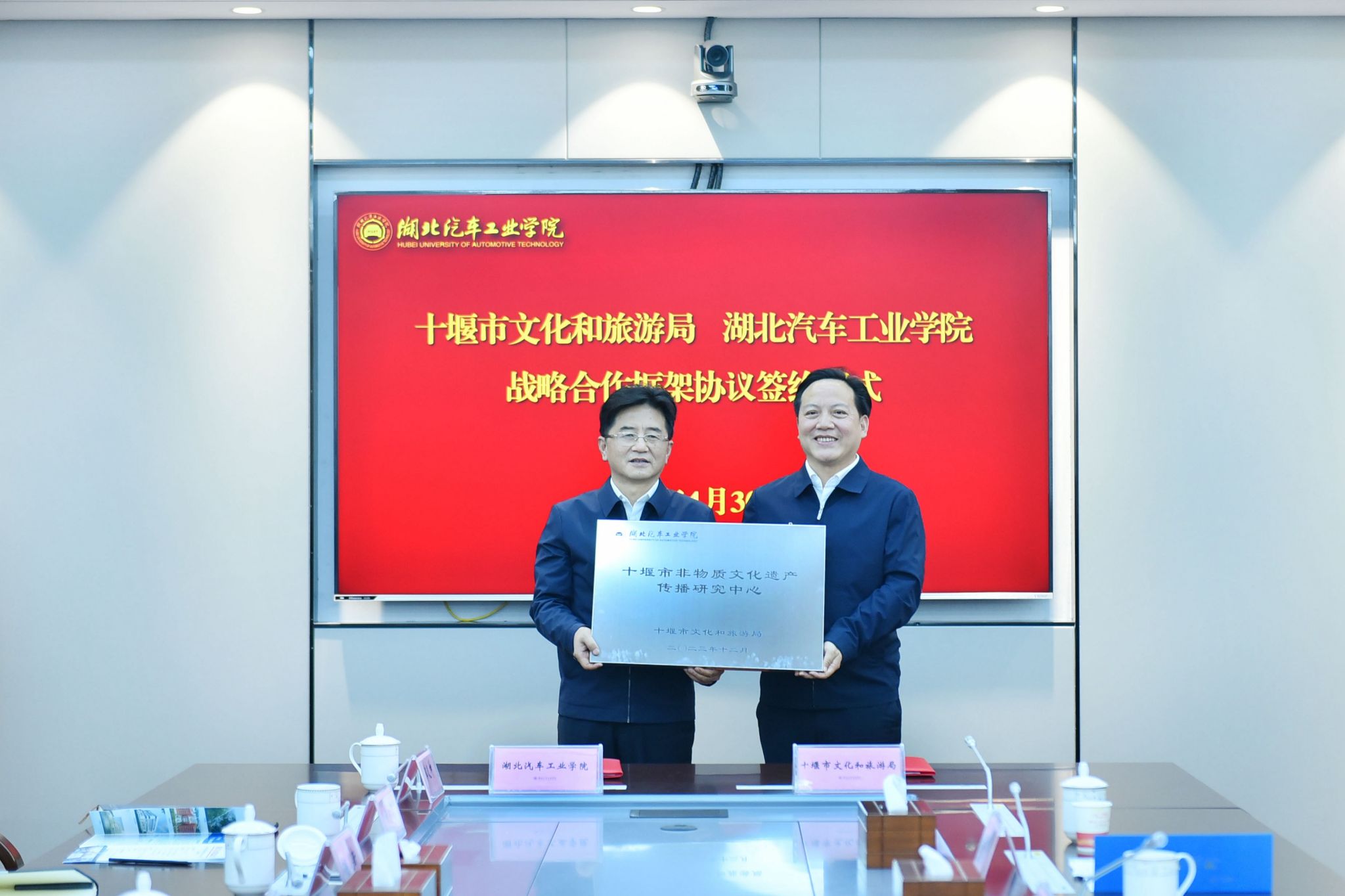 仪式上,张文学、吴善宏分别代表双方签署战略合作框架协议。随后,双方举行“十堰市非物质文化遗产传播研究中心”授牌仪式。