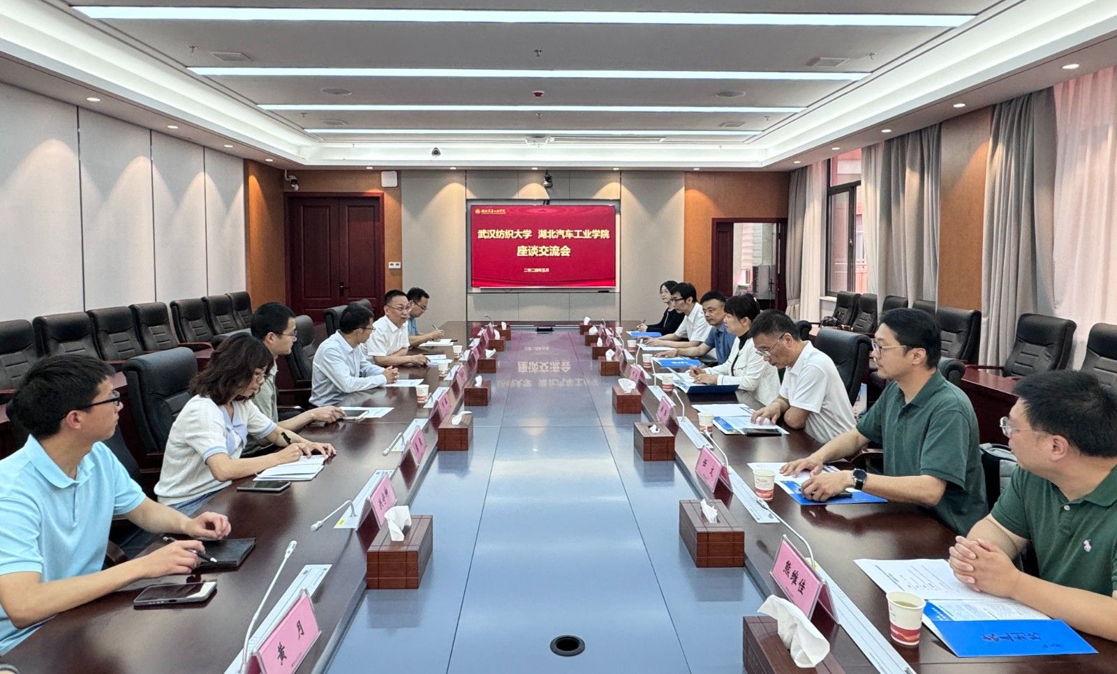 李涛代表学校对刘欣一行来校调研交流表示热烈欢迎,并简要介绍了学校基本情况和“三步走”发展战略。李涛表示,学校与武汉纺织大学交流密切,合作广泛。学校取得的发展和成绩离不开武汉纺织大学的支持与帮助,希望双方进一步深化交流合作,在学科建设与研究生教育以及申博工作中,给予更多的指导与支持,助力学校事业高质量发展。