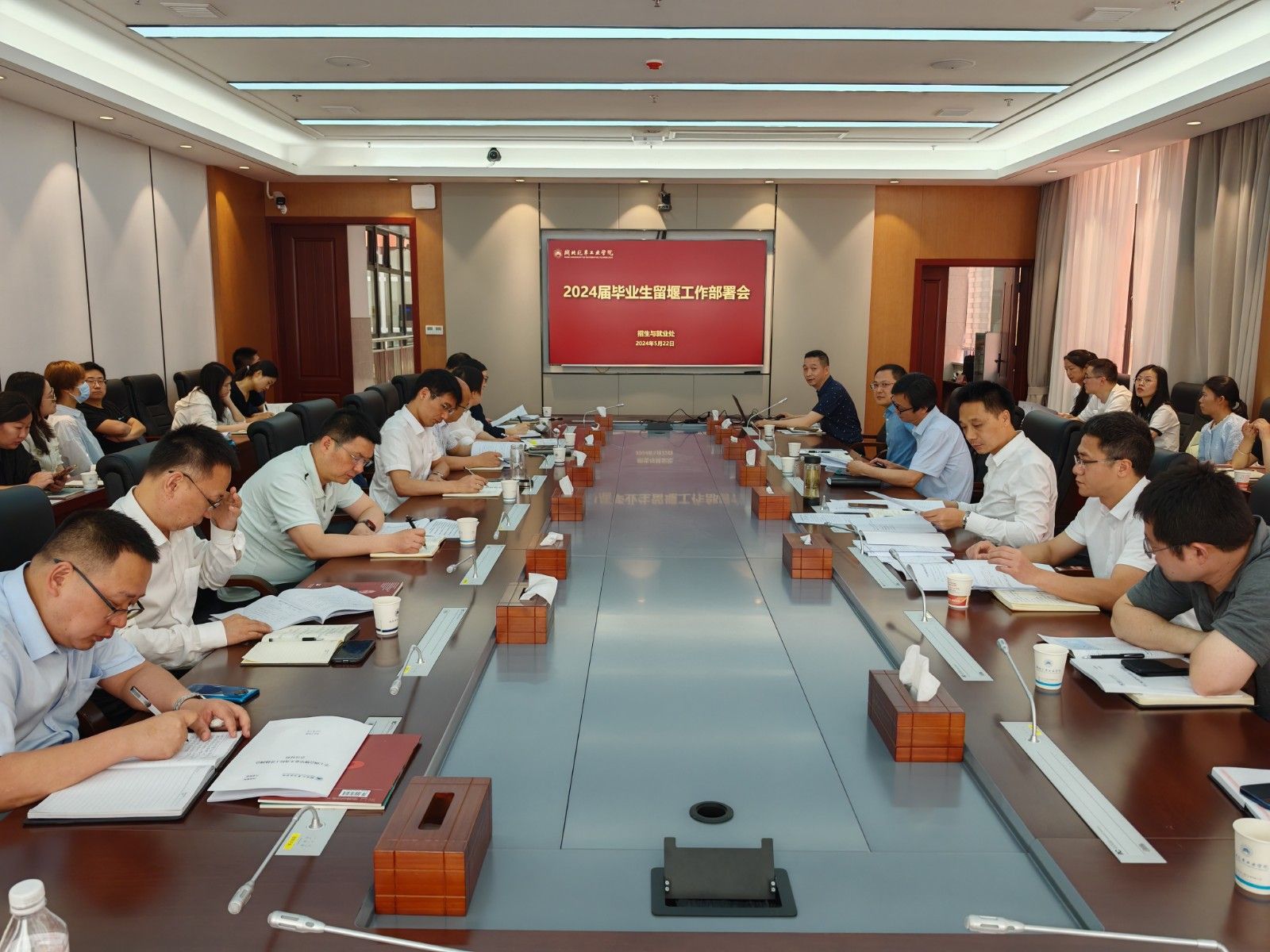 会上,招生与就业处副处长刘荣通报了2024届毕业生就业进展、就业基地建设、访企拓岗、留鄂留堰就业等工作开展情况,并就下阶段开展的档案转递、材料录入、毕业生就业去向确认、就业帮扶、企业行活动等工作进行了安排。