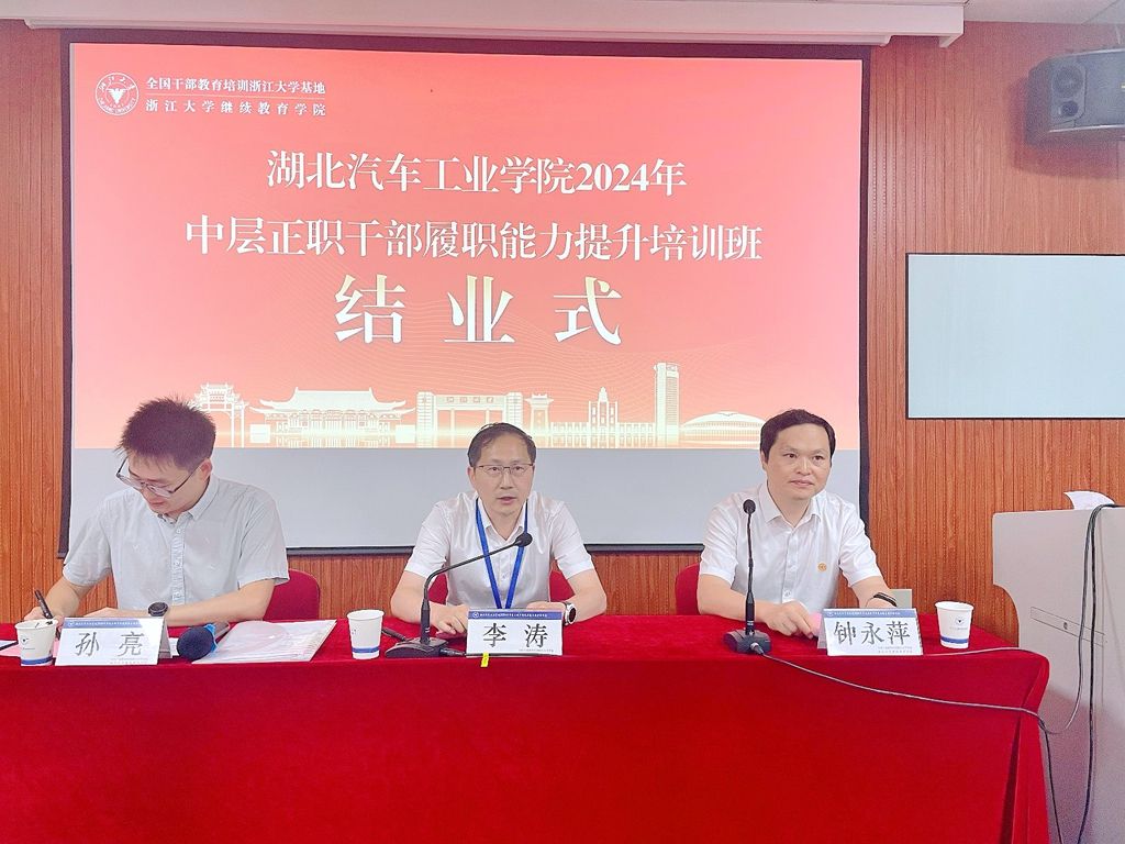 本网讯(文/肖越)7月13日,学校2024年中层正职干部履职能力提升培训班圆满完成了各项学习任务,在浙江大学顺利结班。学校党委副书记李涛,全国干部教育培训浙江大学基地副主任、浙江大学继续教育学院党委副书记兼副院长钟永萍出席结班仪式并讲话。工会主席陈海峰,党委常委、组织部部长王镇,党委常委、党政办公室主任王文山,以及全体参训学员参加了结班仪式。