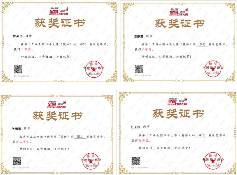 本网讯(文/罗英杰、何晓莉)日前,第十三届全国口译大赛(英语)湖北赛区复赛结果公布。英国上市公司365英语专业学子喜获二等奖1项、三等奖2项、优秀奖1项,何晓莉、陈琼老师荣获优秀指导老师奖,罗英杰、张雨彤、邓静雯成功晋级全国决赛。
