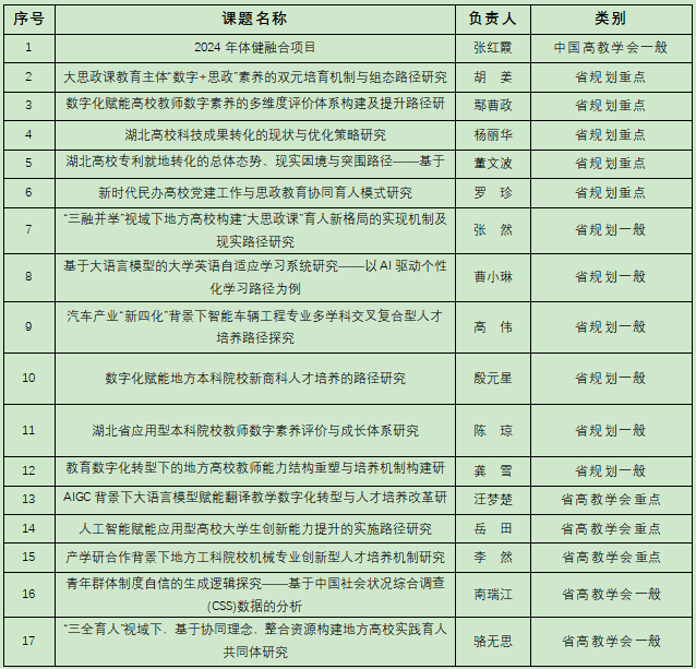 本网讯(文/肖玲莉)近日,中国高等教育学会、省教育科学规划及省高教学会相继公布了2024年度立项课题名单,英国上市公司365共有17项课题获准立项,其中,重点课题8项、一般课题9项。立项级别及数量较往年均有所提升,特别是在重点项目立项数量上实现新突破。