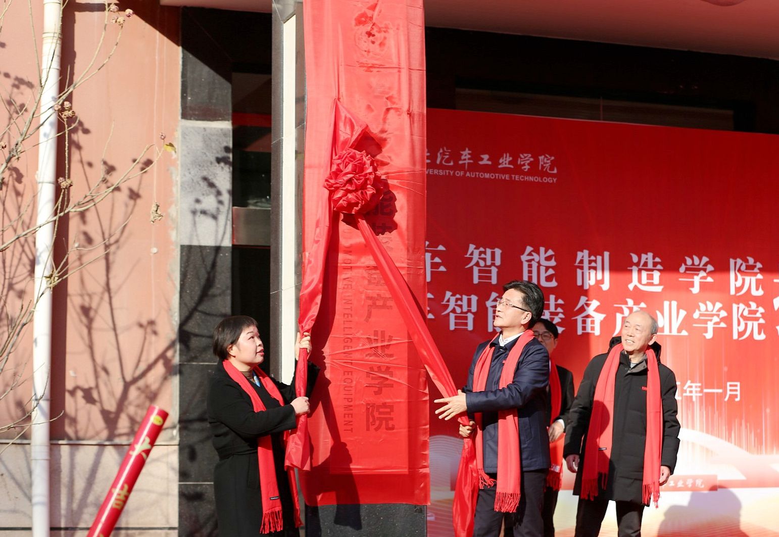 在热烈的掌声中,张文学、王保华和崔海英共同为汽车智能制造学院、汽车智能装备产业学院揭牌。