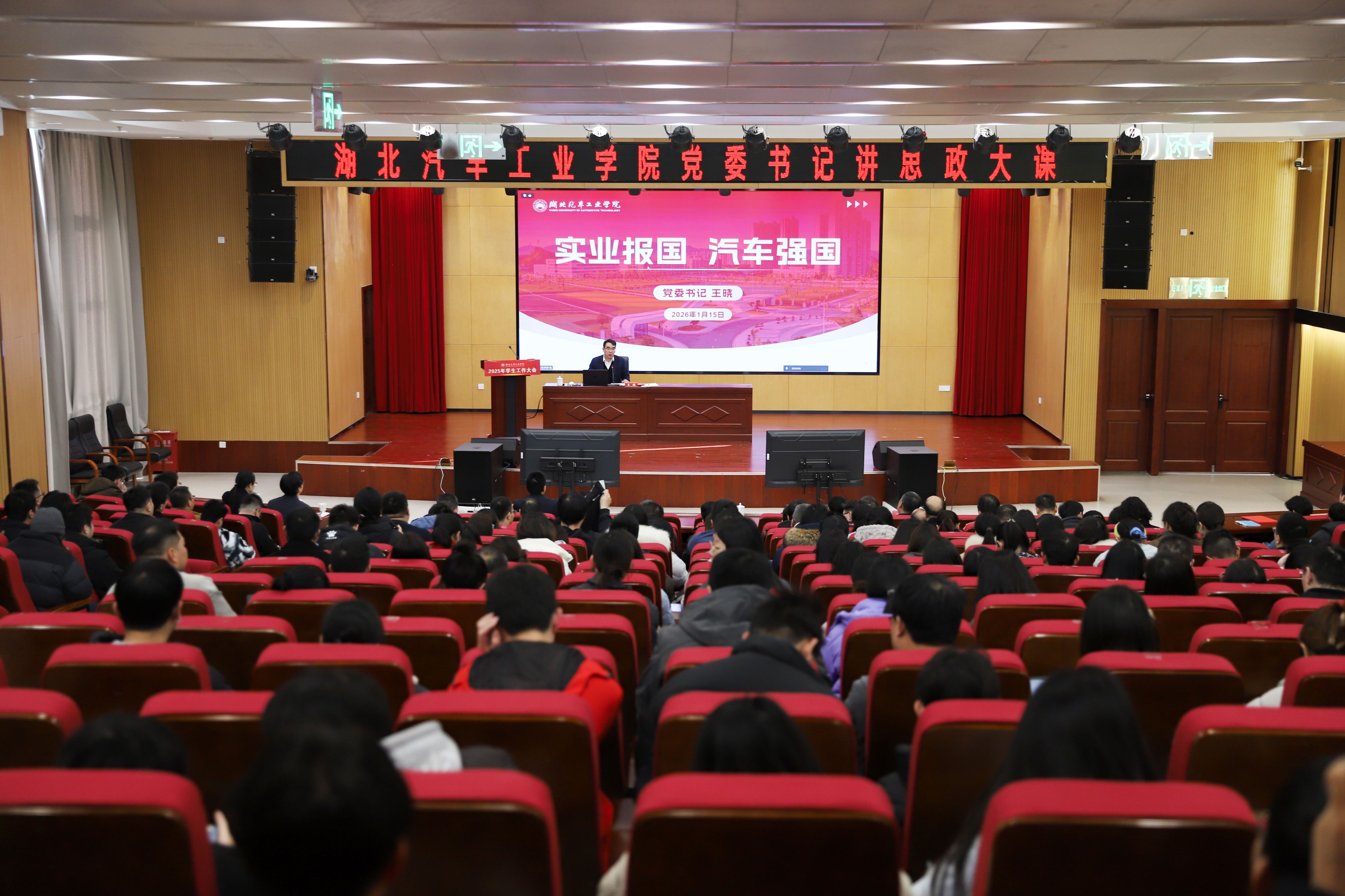 校党委书记王晓以“实业报国 汽车强国”为主题,为全体与会人员讲授了一堂深刻而富有感染力的思政大课。围绕学校与我国汽车产业同频共振的发展历程,生动诠释了“艰苦奋斗、自强不息”的汽院精神。王晓指出,这堂“大思政课”要回答好如何强化政治理论修养、彰显专业亮色,并将其有效转化为育人特色,最终引导学子将个人理想融入国家汽车强国伟业。