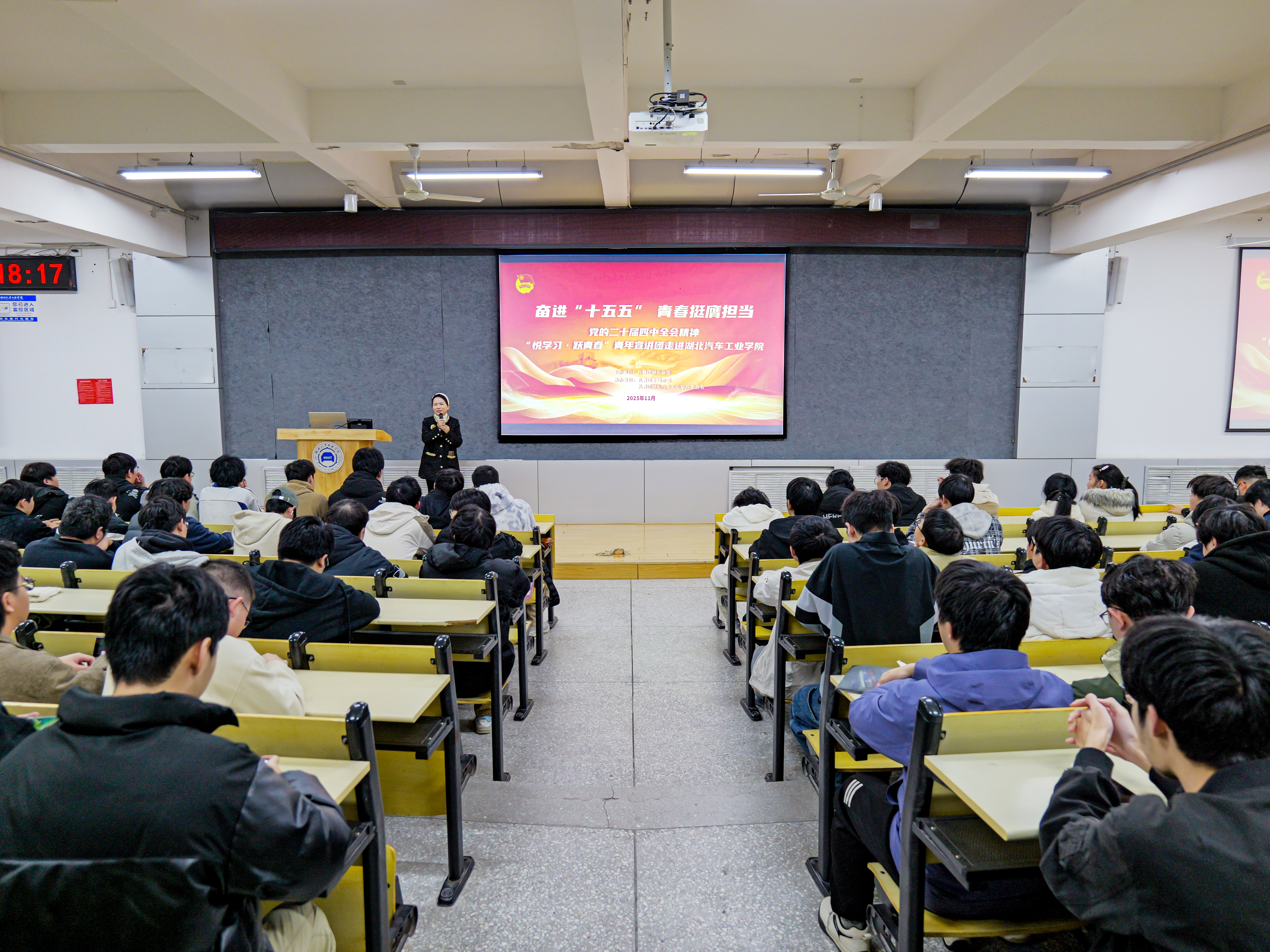 本网讯(文/邹雨函、冯道明)11月30日,共青团湖北省委“悦学习·跃青春”青年宣讲团成员校团委副书记胡霄寒、HUAT车队经理李志成,为机器人与自动化学院师生代表宣讲党的二十届四中全会精神。宣讲会以“奋进‘十五五’——青春挺膺担当”为主题,引导学院师生切实把思想和行动统一到全会精神上。