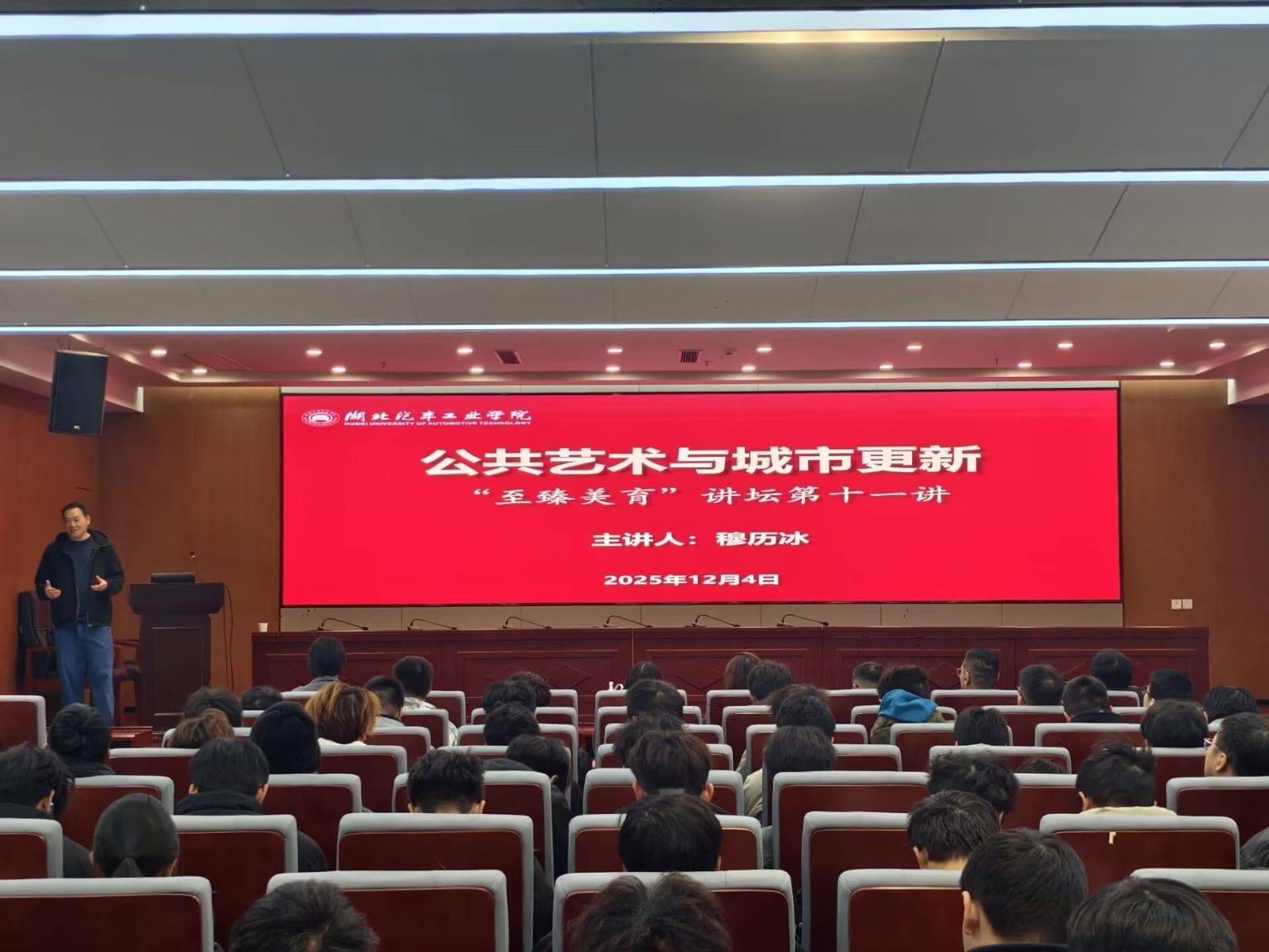 本网讯(文/图 董煌煌、唐赫美)12月4日上午,“至臻美育”讲坛第十一讲在产教大楼三楼报告厅成功举行。特邀中国当代雕塑家、高级工艺美术师穆历冰先生担任主讲嘉宾,以“公共艺术与城市更新”为主题,为在场师生带来了一场兼具美学深度与时代关怀的精彩讲座。活动由美育研究中心、设计学院、学工部、教务处联合主办,全校师生200余人参加,讲座由设计学院院长助理刘敏主持。
