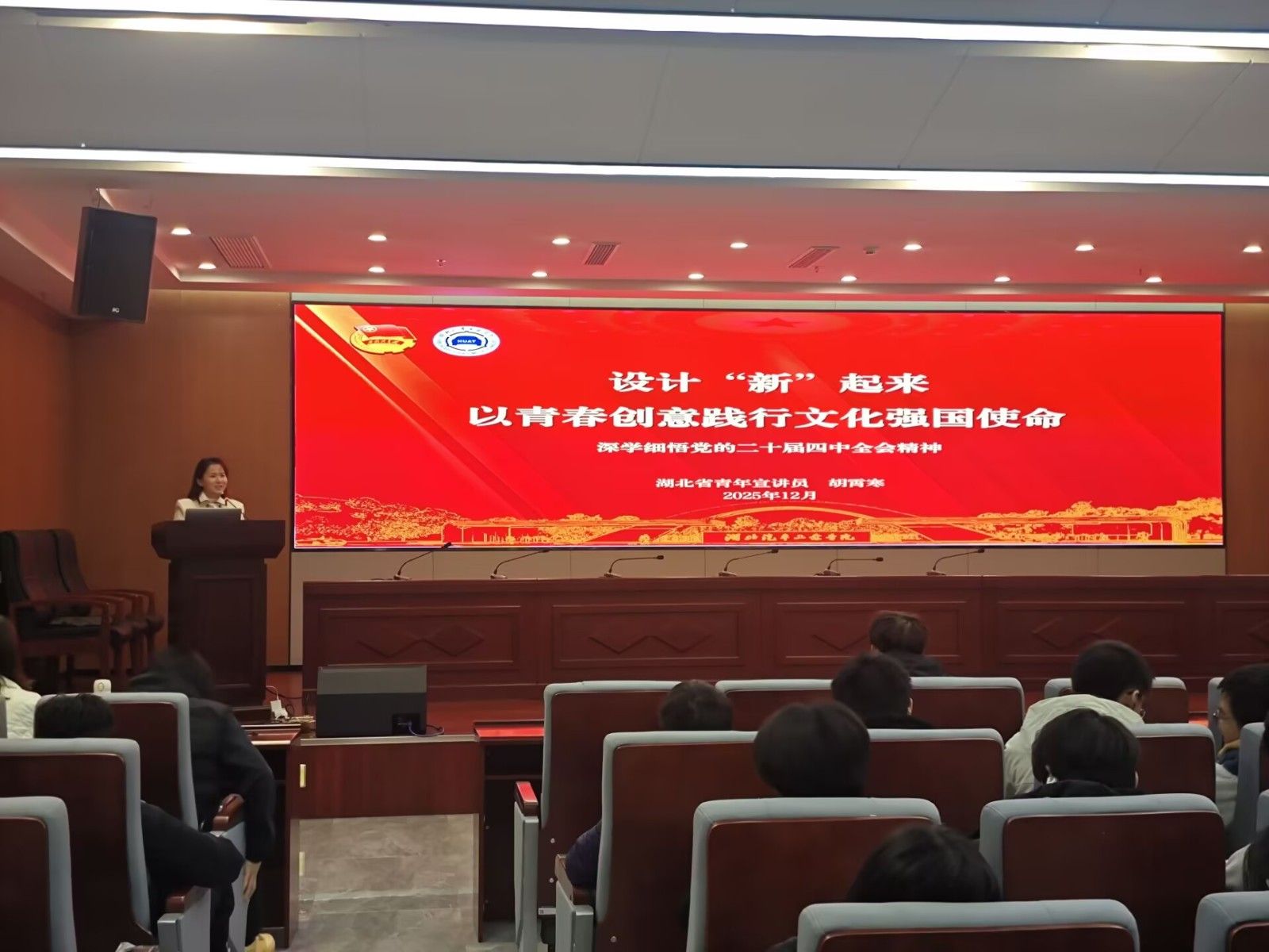 本网讯(文 王曼/图 邹春风)为深入学习贯彻党的二十届四中全会精神,引导青年学生将专业所长与国家发展需求紧密结合,12月7日,设计学院特邀共青团湖北省委青年宣讲团成员、校团委副书记胡霄寒,团省委“00后”宣讲员、汽车工程学院李志成在产教楼三楼报告厅开展“以青春创意赋能强国使命”专题讲座。学院师生代表齐聚现场,汲取奋进力量。