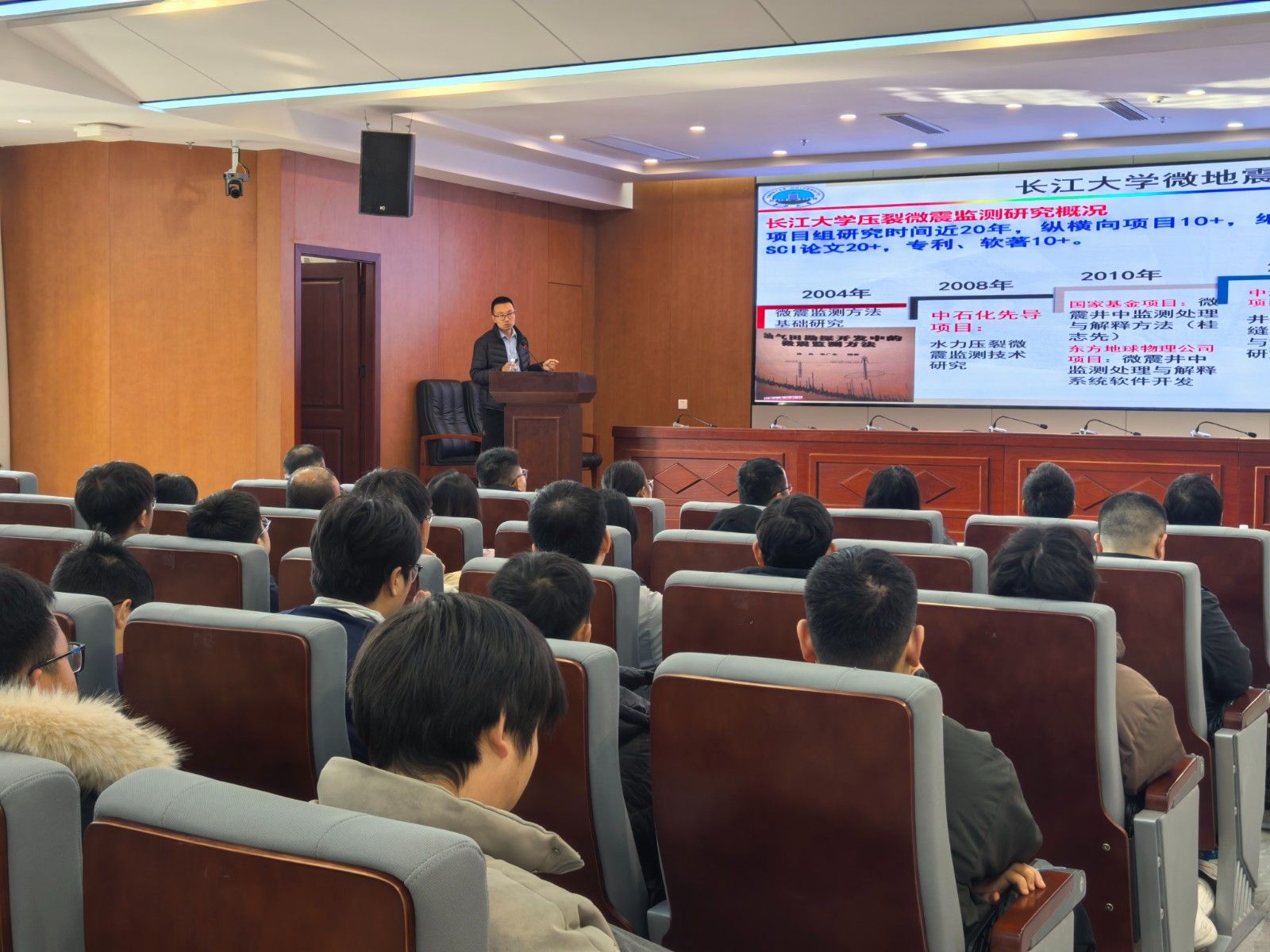 本网讯(文/曾明玉)12月19日,长江大学毛庆辉博士应邀来校开展学术交流,在产教大楼三楼报告厅为人工智能学院师生作了题为“非常规资源压裂微地震监测方法与应用”的学术报告。会议由人工智能学院副院长周原主持,学院全体博士、副高及以上职称教师、全体研究生参加了本次学术活动。