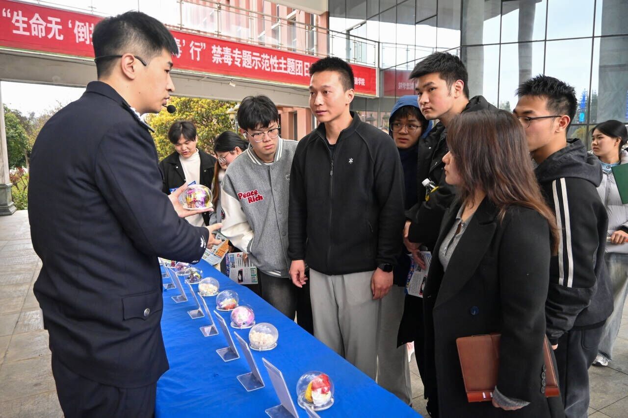 为了让禁毒教育入脑入心,活动将课堂延伸至图书馆前,精心打造了一场“看得见、摸得着、听得进”的禁毒专题展览。30余种仿真毒品模型在现场整齐排列,从传统毒品海洛因、冰毒,到伪装性极强的“奶茶粉”“跳跳糖”“邮票”“上头电子烟”,引得同学们纷纷驻足俯身细看。“原来‘依托咪酯’长这样?这和普通电子烟液根本看不出来区别!”现场学生在听完民警的讲解后,发出阵阵惊呼。民警结合实物,深入浅出地讲解了新型毒品的伪装套路和滥用麻精药品的危害,这种“零距离”的实物警示教育,远比单纯的理论宣讲更具视觉冲击力。同学们在“青春拒毒”打卡区纷纷签名承诺,以实际行动表明对毒品说“不”的坚定决心。