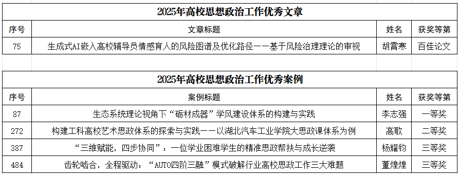 4月13日教育部高校思想政治工作队伍培训研修中心(南昌大学)公布了2025年高校思想政治工作优秀案例评选结果。砺才辅导员工作室李志强老师撰写的案例荣获一等奖;启为有声辅导员工作室高歌老师撰写的案例荣获二等奖,董煌煌老师撰写的案例荣获三等奖;智能网联汽车学院杨耀钧老师撰写的案例荣获三等奖。