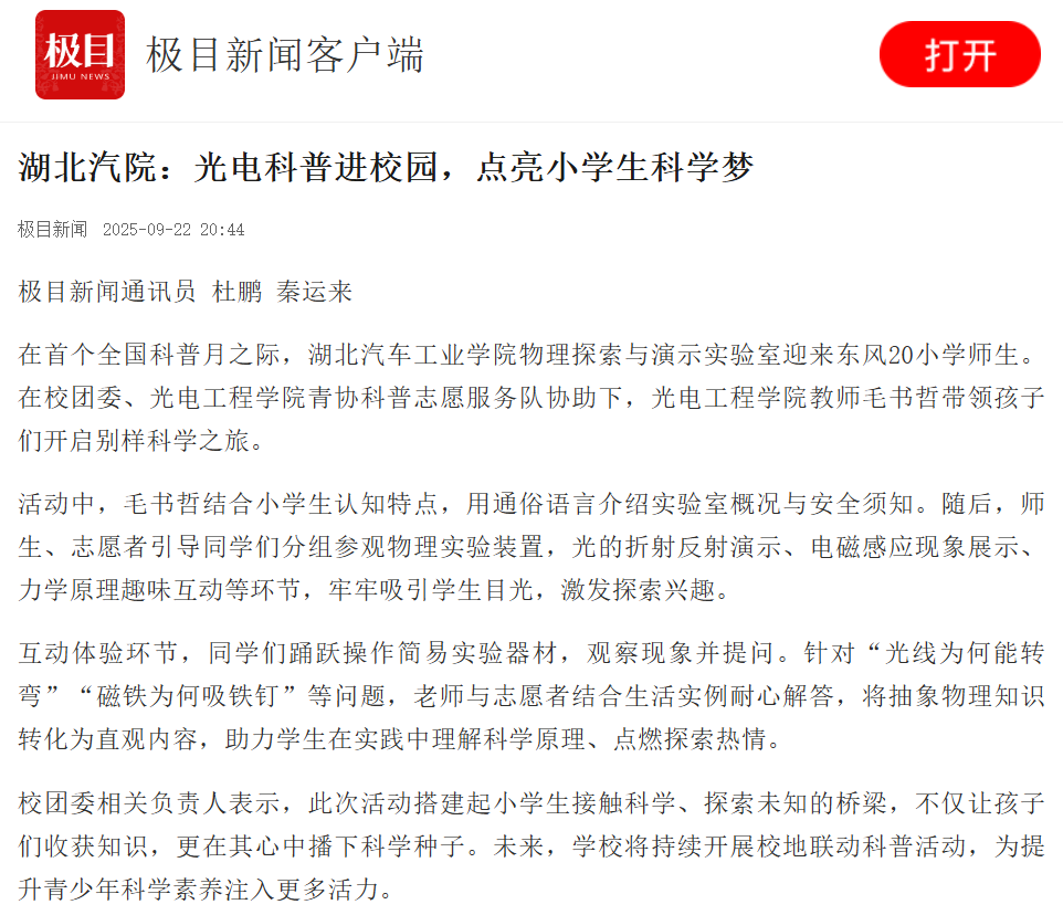 【极目新闻】湖北汽院:光电科普进校园,点亮小学生科学梦