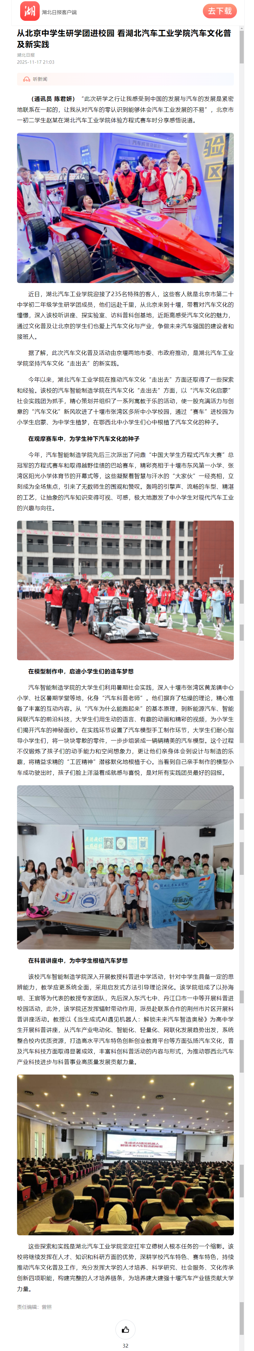 【湖北日报】从北京中学生研学团进校园 看英国上市公司365汽车文化普及新实践